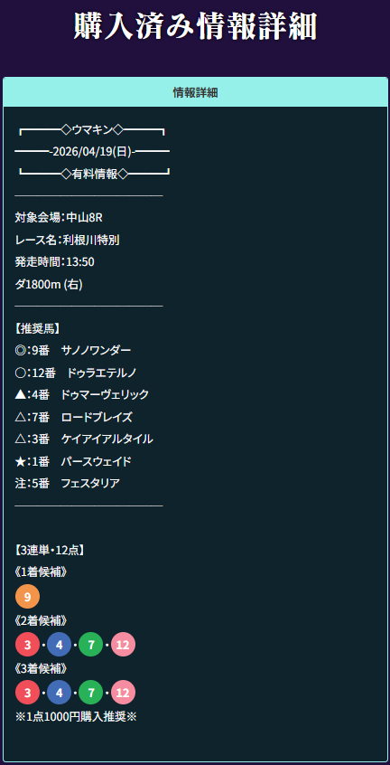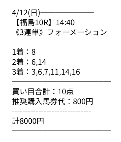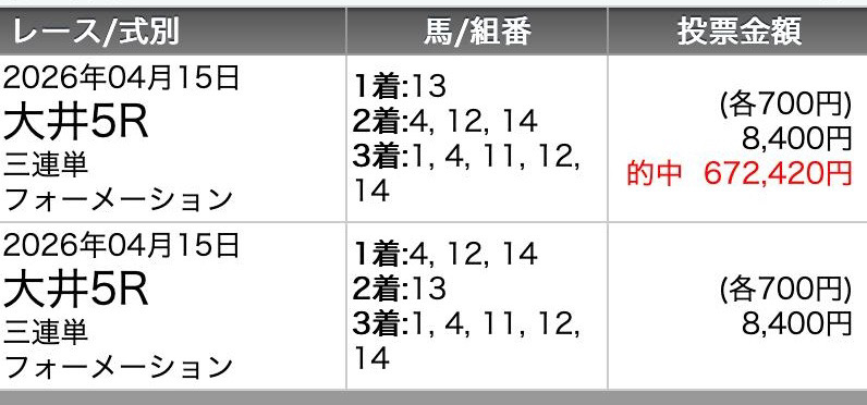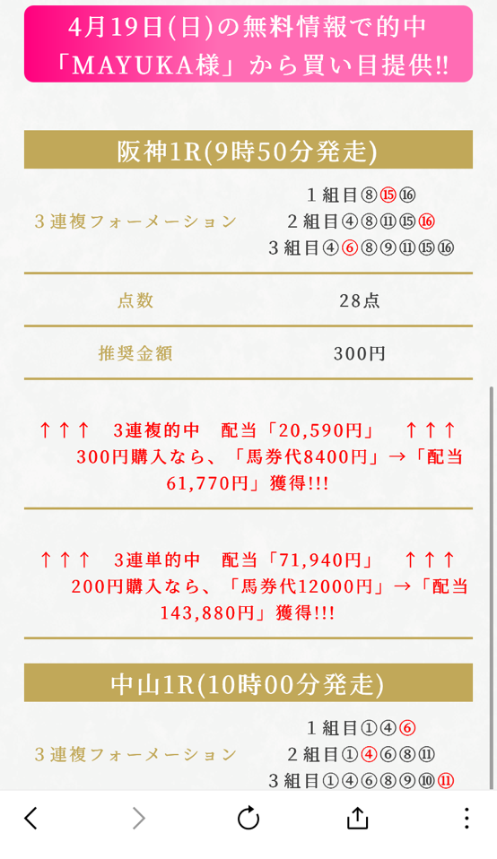 無料情報指定通り購入で爆勝ちw 今回も今回でありがとうでした、4月一発目も9万6700円的中貰えたしやばいっすねこのサイト!