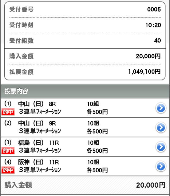 そんな簡単に勝てるなら世話ないだろって感じで利用して1年以上 あんまり口コミとか、食べログとかも書かないけど異常すぎるので結果だけと 桜花賞の3着入ったジッピーチューンは痺れましたね。 最後方からごぼう抜き、オークスでは人気になりそうだけど桜花賞で人気無いうちに獲れて満足 99万2520円払戻し