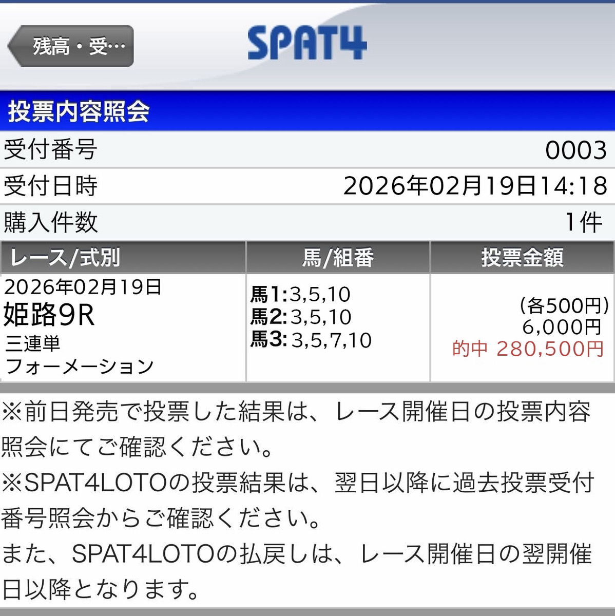 3連単にしては点数は多いけど、1点100円、点数60点、馬券代6千円で3連単4919.5倍当たるなら俺は全然ありだね、俺の師匠である競馬を教えてもらった友達に的中写メ自慢したら40万馬券なんて100点あっても足りない、絶対取れんって言ってた(笑) どんなに競馬歴が長くても使う予想サイトを間違えたら当たるものも当たらないよね、2026年、運命の競馬サイトと巡り合えました。