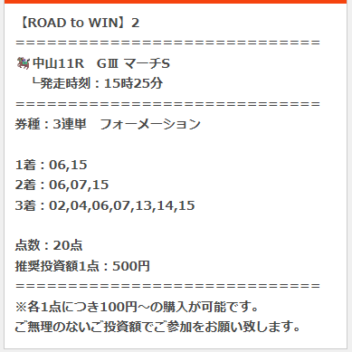 マーチステークス、⑥ヴァルツァーシャル、⑮サンデーファンデー2本軸の買い目。